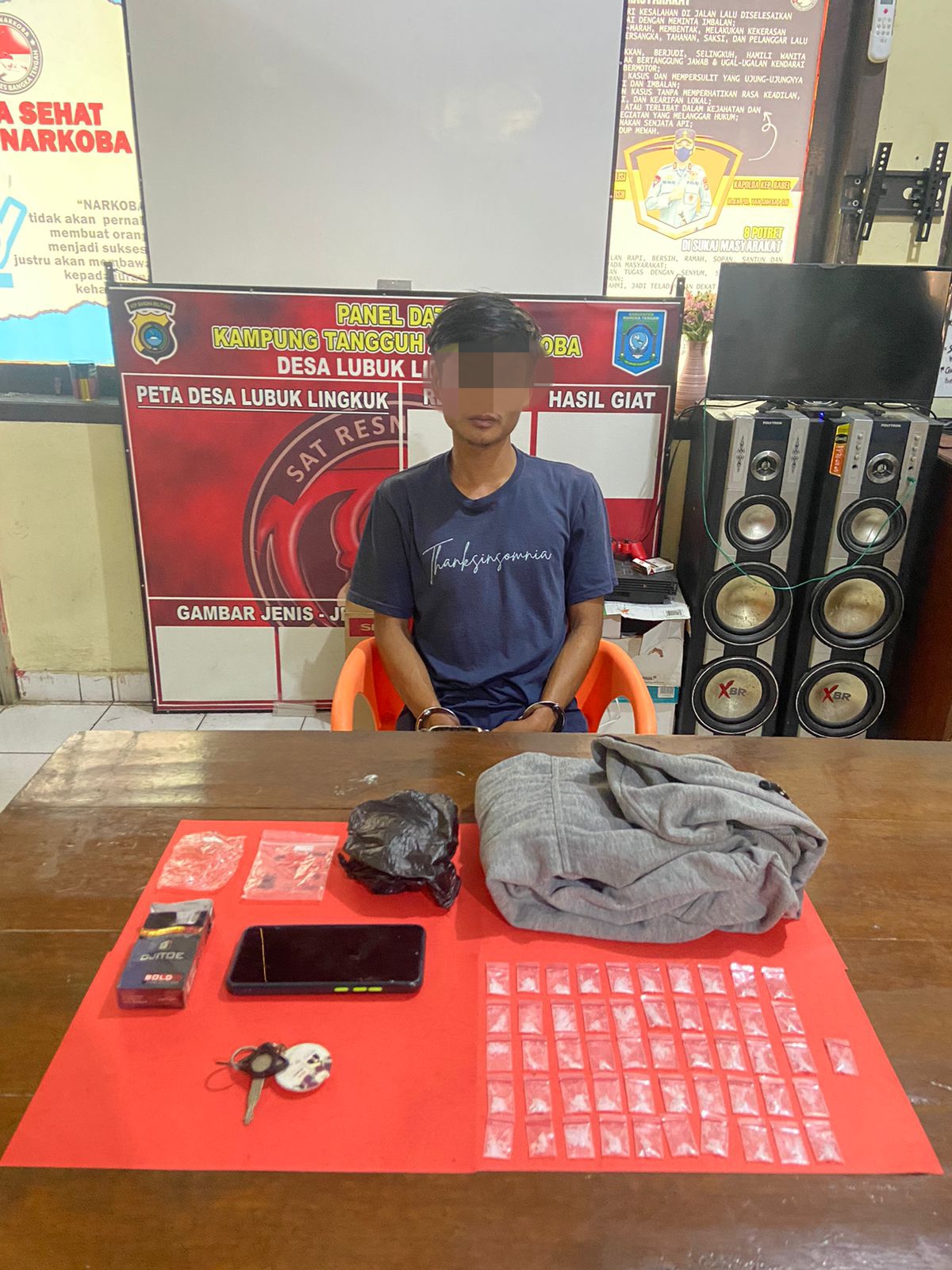 “Sekira pukul 11.00 wib pelaku Jepri ini kami amankan saat sedang berada dijalan perkebunan warga yang memang kami sudah menerima informasi terkait aktifitas pelaku sebagai pengedar narkoba jenis sabu – sabu”. Ucapnya.