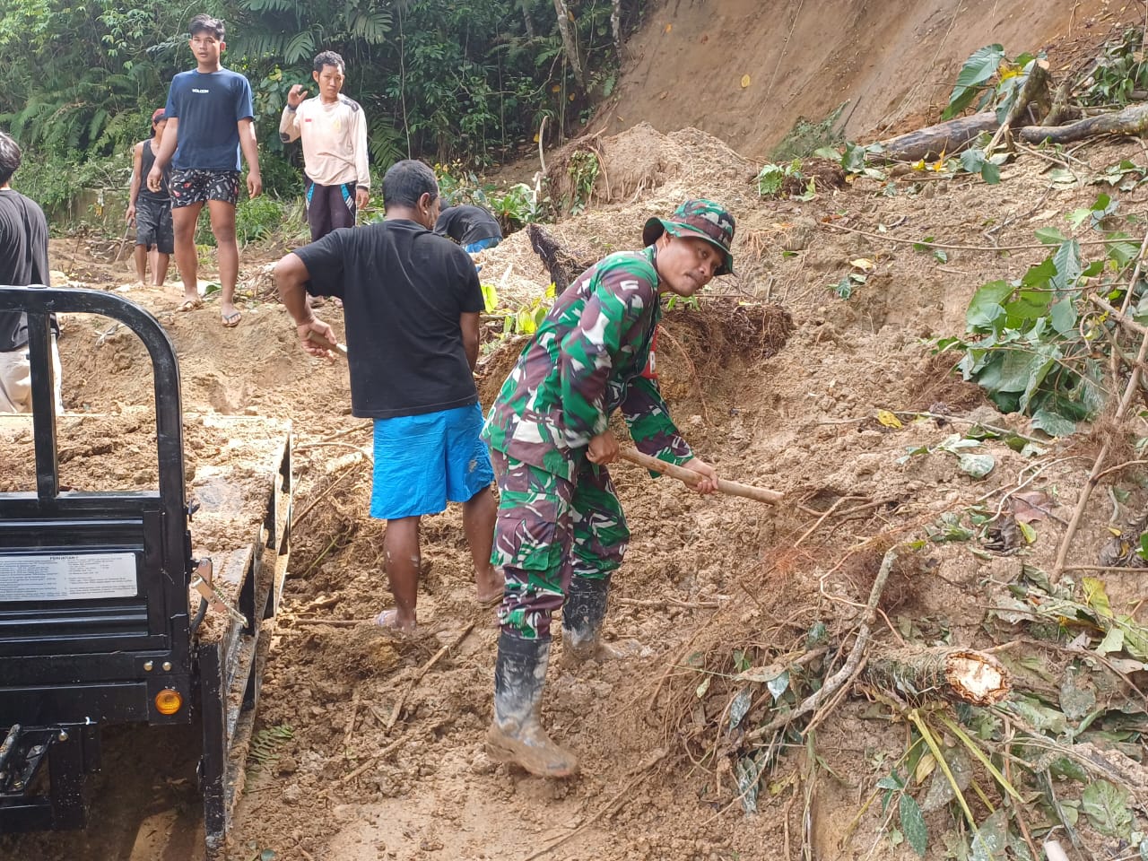 Pariaman, exsekusinews.id – Bertempat di Dusun Barukubu, Desa Cubadak Air, Kecamatan PariamanUtara, KotaPariaman. Babinsa Koramil 01/ Prm Serda Jontua Tamba bersama warga menggelar kegiatan karya bakti untuk membersihkan material tanah yang menutupi jalan akibat longsor. Jalan yang sebelumnya tidak dapat dilalui itu kini mulai terbuka kembali berkat kerja sama dan semangat gotong royong seluruh masyarakat, Selasa (02/12/2025).
